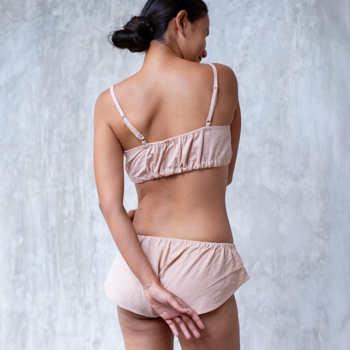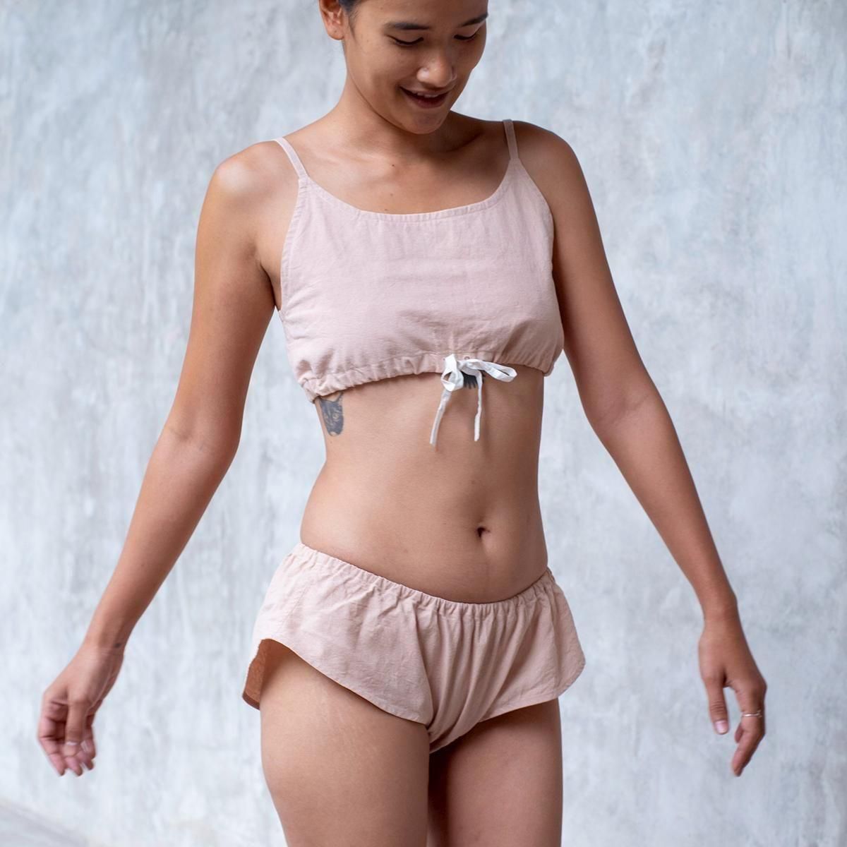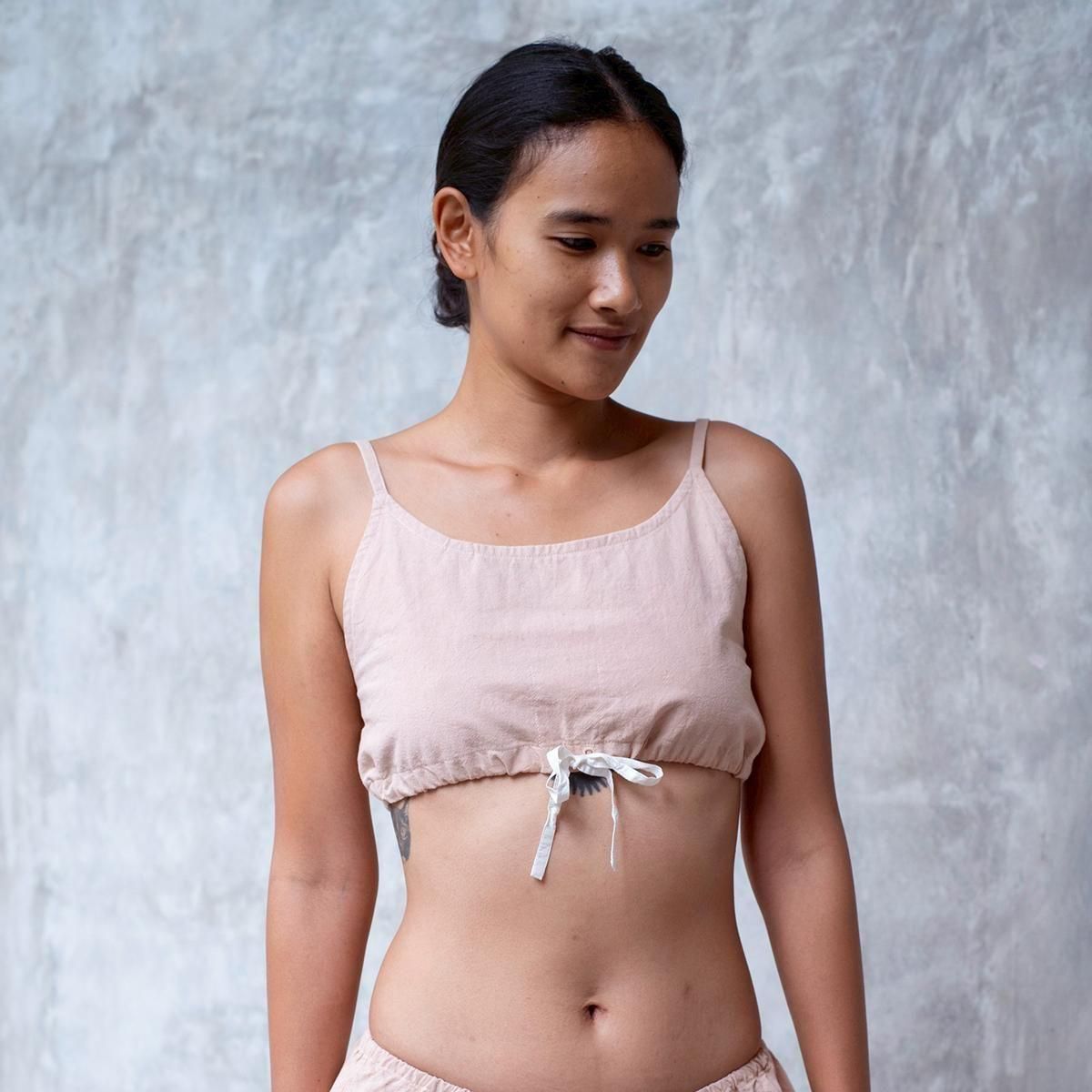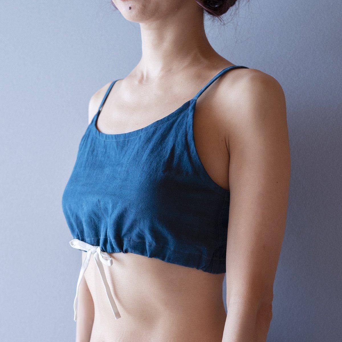 ヘンプ素材は、吸水発散性に優れていて、ベトつきや臭いの心配はなく、さらりとした着心地が魅力的✨ シルク布でゴムを包んだアンダーバストのリボンは、締め付け感がなく、動きやすさとサイズの調節が可能です。ストラップは2つのボタンで調節できるのも便利✨