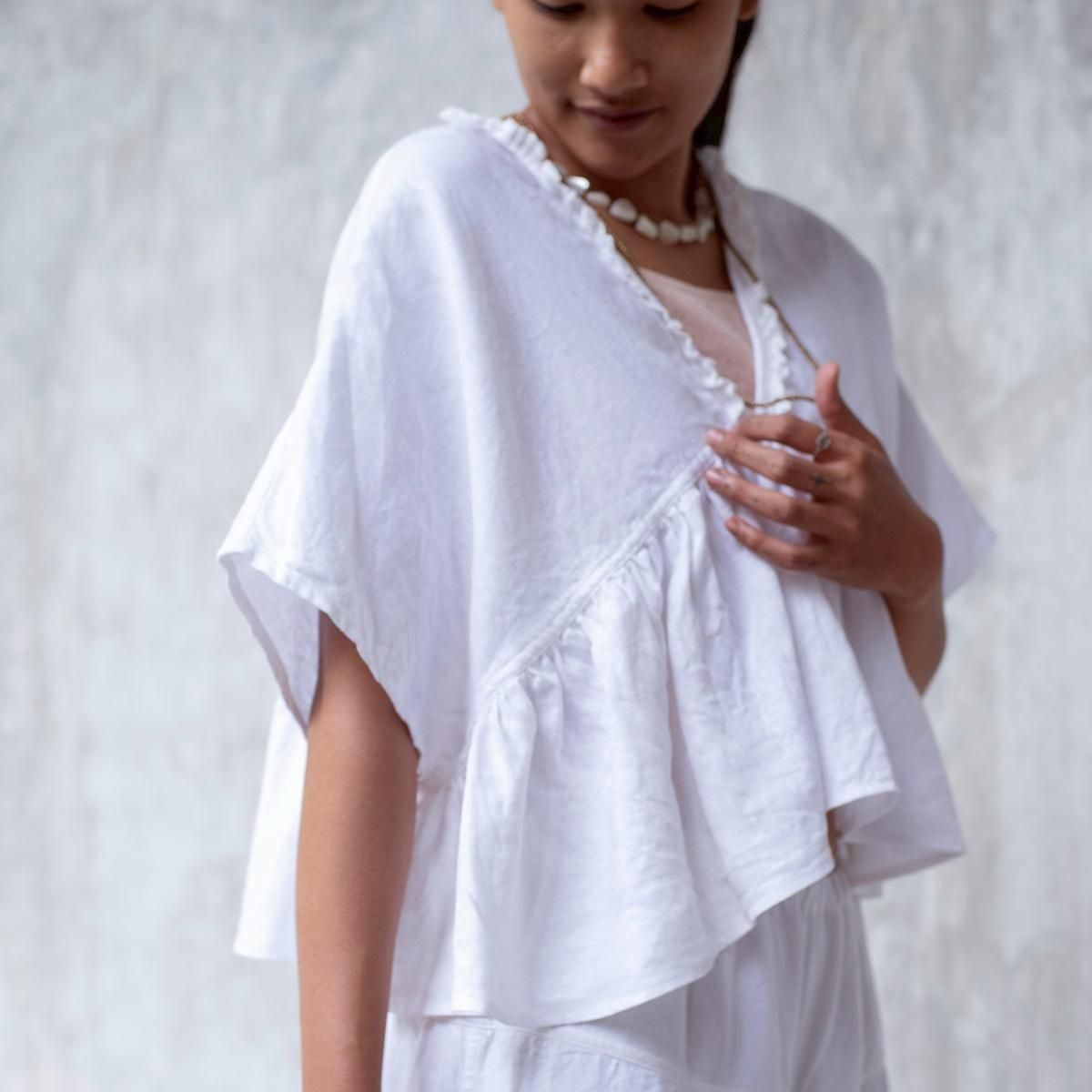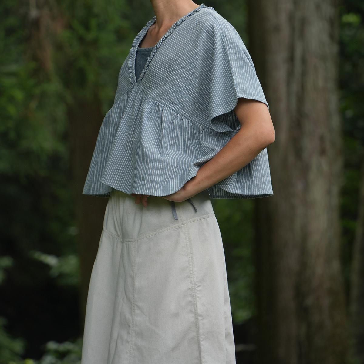 短めの丈感とギャザーのボリューム感が絶妙なバランスで、スタイルを綺麗に見せてくれます。